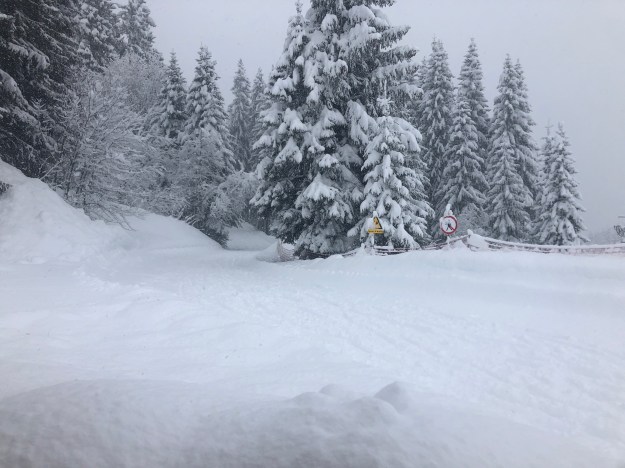 Il neige fort depuis 5 heures du matin . Zéro degrés et vent nul.