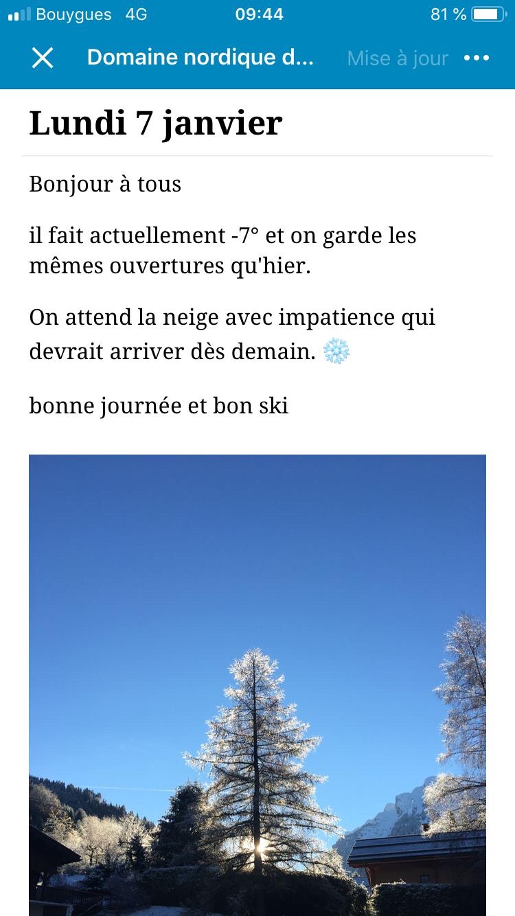 la neige est dure damée le glisse excellente, les ouvertures de pistes n’ont pas changées et 11 km sont tracés en styles classique et skating.