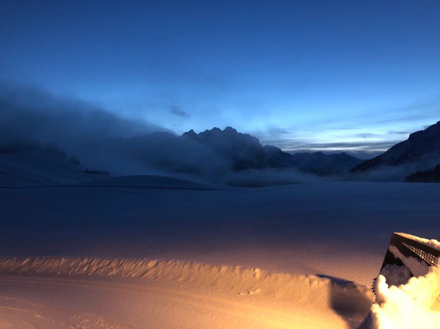 Nous avons eu 5 cm de neige fraîche cette nuit, ce matin il faut -5 degrés et tout le domaine est ouvert… Voici la photo ambiance du damage matinal.